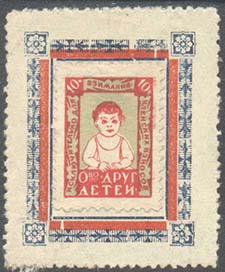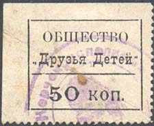 1925 1925(?) г. Разм. по перфорации 36 х 29 мм. Одноцветная печать на белой бумаге. Зубц. 11 1/4. В прямо-угольной рамке разм. 28 х 22 мм сверху текст в две строки: «Общество «Друзья Детей»». Внизу под горизонтальной чертой номинал.