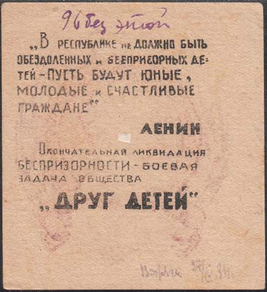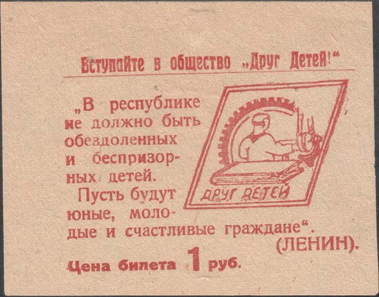 1926 1926(?) г. Разм. 92 х 72 мм. Одноцветная печать на рыхлой желтоватой бумаге. В центре слева текст в восемь строк: ««В республике не должно быть обездоленных и беспризорных детей. Пусть будут юные, молодые и счастливые граждане» (Ленин)». Справа значок ОДД. Сверху текст: «Вступайте в общество «Друг Детей!»». Справа внизу текст: «Цена билета 1 руб.».