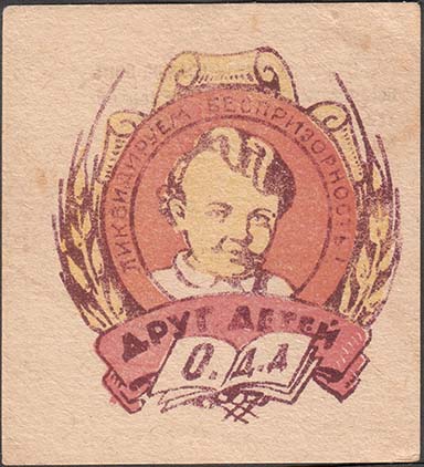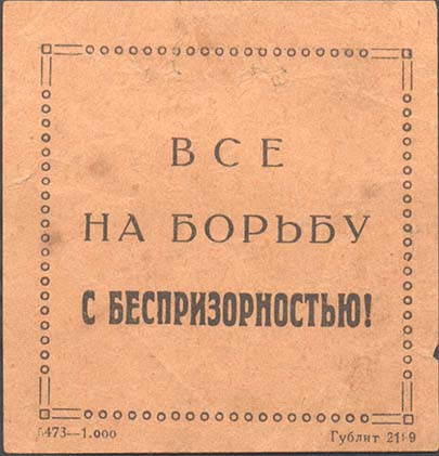 1924 1924(?) г. Разм. 68 х 70 мм. Одноцветная печать на желто-коричневой бумаге. В центре в прямоугольной декоративной рамке разм. 58 х 58 мм текст в три строки: «Все на борьбу с беспризорностью». Внизу под рамкой мелким шрифтом выходные данные: «5473-1.000 Гублит 2189».