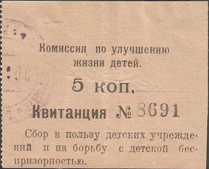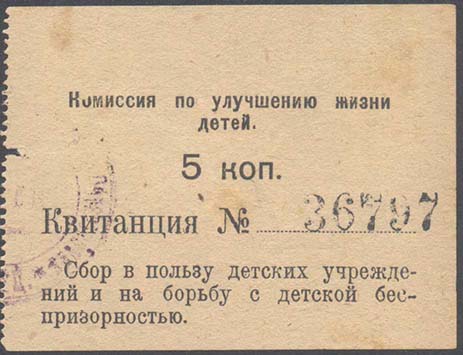 1925 1925 г. Разм. 77 х 60 мм. Одноцветная печать на желтоватой бумаге. Односторонняя зубцовка с левой стороны. Зубц 11 1/2. Текст в семь строк: «Комиссия по улучшению жизни детей. ... коп. квитанция №... Сбор в пользу детских учреждений и на борьбу с детской беспризорностью.».