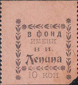 1925 1925(?) г. Разм. по перфорации 31 х 34 мм. Одноцветная печать розоватой бумаге. Вертикальная зубц. 11 1/2. В декоративной рамке в центре текст в четыре строки: «В фонд имени В.И.Ленина». Внизу номинал.