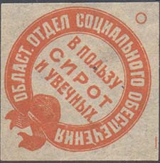 1926 1926(?) г. Ромб разм. 53 х 53 мм. Одноцветная печать на тонкой серой бумаге. В центре в круглой рамке в виде ленты диаметром 35 мм текст в три строки: «В пользу сирот и увечных». На ленте по кругу текст: «Област[ной]. Отдел социального обеспечения».