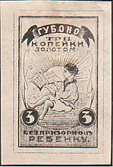 1926 1926(?) г. Разм. 33 х 50 мм. Одноцветная печать на белой плотной бумаге. В центре в двойной прямо-угольной рамке разм. 27 х 43 мм сидящий с книгой в руке мальчик на фоне солнца с лучами. Сверху на ленте текст: «ГУБОНО». Ниже текст в три строки: «Три копейки золотом». Внизу в кружках номинал. Ниже текст в две строки: «Беспризорному ребенку».