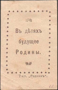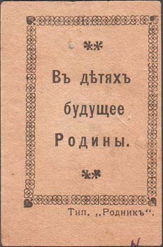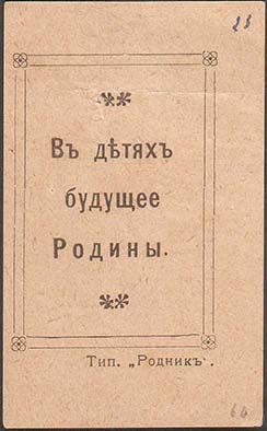 1916 1916 г. Разм. Разм. 41 х 64 мм. Одноцветная печать на бумаге различных цветов. В прямоугольной рамке разм. 31 х 45 мм различных типов текст в три строки: «В детях будущее Родины». Сверху и снизу растительные декоративные элементы. Внизу под рамкой выходные данные мелким шрифтом: «Тип. «Родник»».