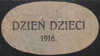 1916 1916 г. Виньетка в форме овала разм. 70 х 38 мм. Одноцветная печать на серой бумаге. В центре текст на польском языке: «Детский день». Ниже дата: «1916».