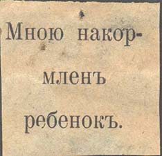 1917 1917 г. Разм. 34 х 38 мм. Одноцветная печать на желтовато-серой бумаге. В центре текст в три строки: «Мною накормлен ребенок».
