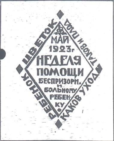 1923 1923 г. Май. Разм. 72 х 88 мм. Одноцветная печать на желтоватой бумаге. В центре в ромбовидной рамке разм. 40 х 54 мм текст в семь строк: «Неделя помощи беспризорн[ому]. и больному ребенку». Сверху растительный орнамент и текст в две строки: «Май 1923 г.». По наружному периметру рамки текст, разделенный декоративными элементами в виде ромбов «Ребенок цветок. Каков уход таков и плод».