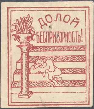 1924 1924 г. Разм. 51 х 58 мм. Одноцветная печать на кре-мовой бумаге. В центре в двойной прямоугольной рамке разм. 45 х 54 мм беспризорник, лежащий на ступеньках. Слева колонна с вазой с цветами сверху. Сверху в две строки текст: «Долой беспризорность!».