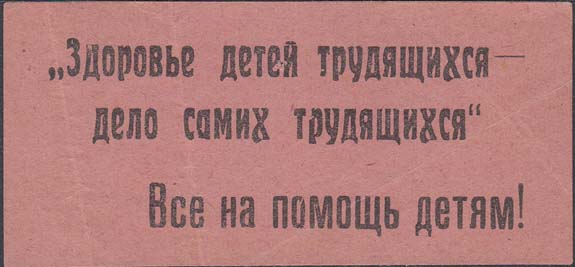 1924 1924(?) г. Разм. 96 х 44 мм. Одноцветная печать на розовой бумаге. В центре текст в три строки: ««Здоровье детей трудящихся – дело самих трудящихся». Все на помощь детям!».