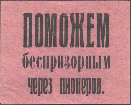 1924 1924(?) г. Разм. 77 х 61 мм. Одноцветная печать на бумаге различных цветов. В центре текст в три строки: «Поможем беспризорным через пионеров».