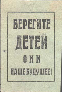 1924 1924(?) г. Разм. 40 х 60 мм. Одноцветная печать на серо-зеленой бумаге. В центре в прямоугольной рамке разм. 31 х 46 мм текст в четыре строки: «Берегите детей они наше будущее».