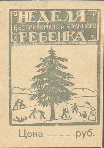 1925 1925(?) г. Разм. 58 х 83 мм. Одноцветная печать на сероватой бумаге. В прямоугольной рамке разм. 51 х 65 мм в центре елка, горки и играющие дети. Сверху текст в три строки: «Неделя беспризорного и больного ребенка». Внизу под рамкой текст: «Цена... руб.».