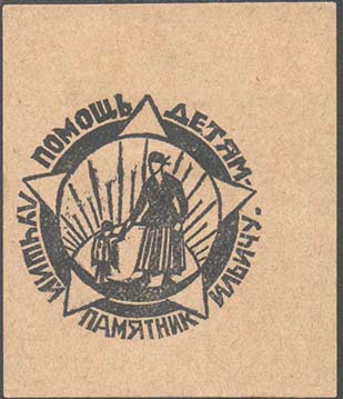 1925 1925(?) г. Разм. 52 х 60 мм. Одноцветная печать на бумаге различных цветов. В центре круглой рамки, вписанной в пятиконечную звезду женщина, держащая за руку ребенка на фоне восходящего солнца. По окружности текст: «Помощь детям – лучший памятник Ильичу».