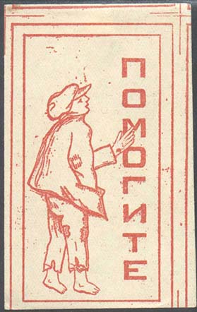 1925 1925 г. Декабрь Разм. рамки 39 х 70 мм. Одноцветная печать на тонкой желтоватой бумаге. В двойной прямоугольной рамке слева беспризорный ребенок. Справа вертикально сверху вниз текст: «Помогите». По углам знака разграничительные линии.