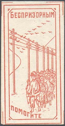 1925 1925(?) г. Разм. рамки 31 х 66 мм. Одноцветная печать на белой бумаге. В центре в двойной прямоугольной рамке группа беспризорных детей на фоне телеграфных столбов и косяка птиц. Сверху текст: «Беспризорным» внизу продолжение текста: «Помогите». По углам знака разграничительные линии.