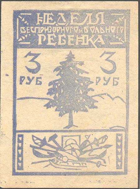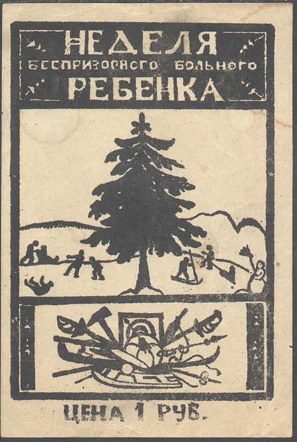1925 1925(?) г. Листок разм. 70 х 104 мм. Одноцветная печать на белой бумаге. В центре в прямоугольной рамке разм. 63 х 90 мм елка, горки и играющие дети. Сверху текст в три строки: «Неделя беспризорного и больного ребенка». Внизу разнообразный спортивный инвентарь. Под рамкой внизу номинал: «Цена 1 руб.».