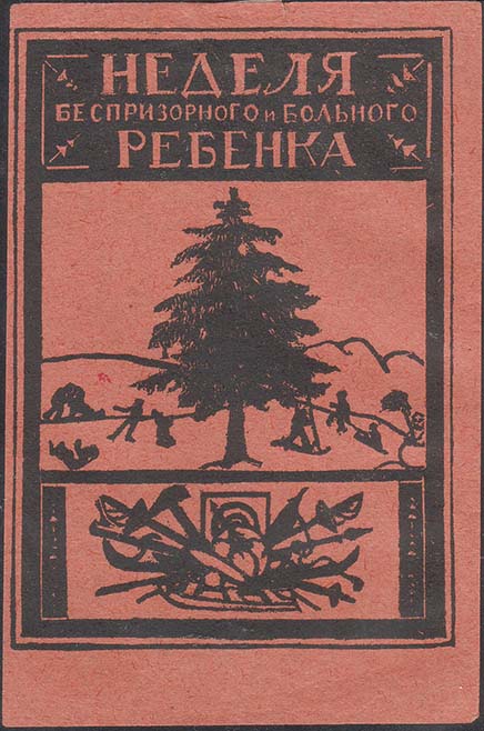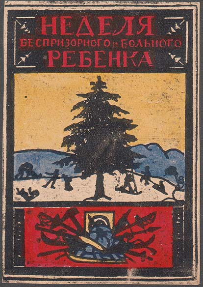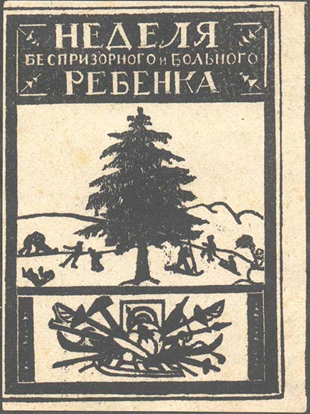 1925 1925(?) г. Листок разм. 73 х 99 мм. Одноцветная печать на бумаге различных цветов. В центре в прямоугольной рамке разм. 66 х 94 мм елка, горки и играющие дети. Сверху текст в три строки: «Неделя беспризорного и больного ребенка». Внизу разнообразный спортивный инвентарь.