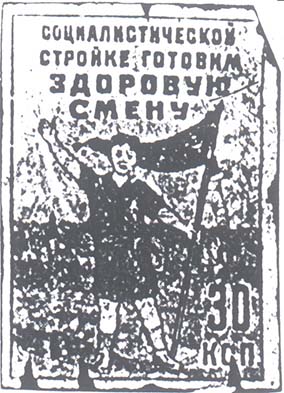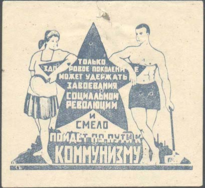 1925 1925(?) г. Разм. 68 х 63 мм. Одноцветная печать на белой бумаге. В центре пятиконечная звезда, по краям юноша и девушка. На звезде текст в шесть строк: «Только здоровое поколение может удержать завоевания социальной революции». Внизу продолжение текста в четыре строки: «И смело пойдет по пути к коммунизму».