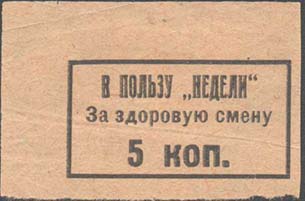1925 1925(?) г. Разм. 51 х 26 мм. Одноцветная печать на желто-ватой бумаге. В центре в прямоугольной рамке разм. 38 х 20 мм. Текст в две строки: «В пользу «Недели» За здоровую смену».