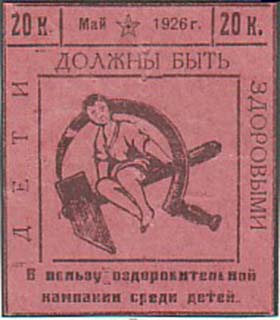 1926 1926 г. Май. Разм. 44 х 55 мм. Одноцветная печать на серо-карминовой бумаге. В центре в двойной прямоугольной рамке серп и молот, на рукоятке которого сидит ребенок. По периметру между рамками текст: «Дети должны быть здоровыми. В пользу оздоровительной компании среди детей». Сверху пятиконечная звезда и текст: «Май 1926 г.». Сверху по углам номинал.