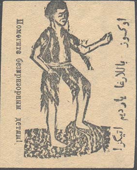 1926 1926(?) г. Разм. 34 х 70 мм. Одноцветная печать на белой бумаге. В центре беспризорник. Слева вертикально сверху вниз текст: «Помогите беспризорным детям!». Справа вертикально текст на местном языке арабским шрифтом.