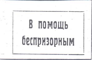 1926 1926(?) г. Разм. 50 х 33 мм. Одноцветная печать на бумаге различных цветов. В центре в прямоугольной рамке разм. 23 х 40 мм текст в две строки: «В помощь беспризорным».