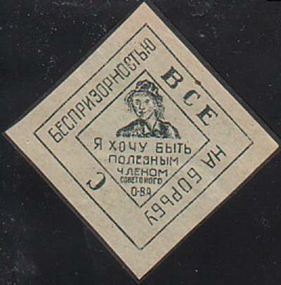 1926 1926(?) г. Разм. 67 х 67 мм. Одноцветная печать на серо-зеленой бумаге. В центре в двойной рамке в форме ромба разм. 52 х 52 мм погрудное изображение беспризорного ребенка. Ниже текст в пять строк: «Я хочу быть полезным членом советского о-ва». Текст по периметру между рамками: «Все на борьбу с беспризорностью».