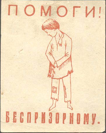 1926 1926(?) г. Разм. 61 х 77 мм. Одноцветная печать на плотной белой бумаге. В центре беспризорник. Сверху текст: «Помоги!». Внизу продолжение текста: «Беспризорному».
