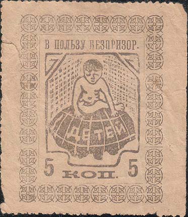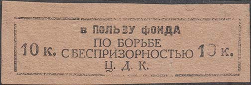 1926 1926(?) г. Разм. 84 х 28 мм. Одноцветная печать на серой бумаге. В центре в прямоугольной рамке разм. 77 х 18,5 мм текст в четыре строки: «В пользу фонда по борьбе с беспризорностью Ц.Д.К.». По бокам номинал.