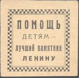 1926 1926(?) г. Разм. 46 х 45 мм. Одноцветная печать на бумаге различных цветов. В центре в прямоугольной рамке разм. 36 х 36 мм с шахматным узором текст в четыре строки: «Помощь детям – лучший памятник Ленину».