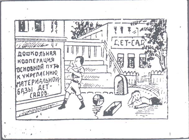 1926 1926(?) г. Листок разм. 104 х 77 мм. Одноцветная печать на розово-серой плотной бумаге. В центре в прямоугольной рамке разм. 85 х 56 мм двое детей на фоне детского сада. На стене текст в семь строк: «Дошкольная кооперация основной путь к укреплению материальной базы детсадов».