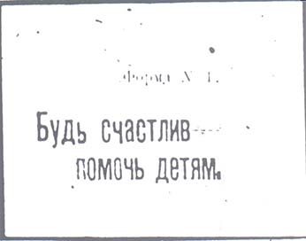 1926 1926(?) г. Разм. 60 х 45 мм. Одноцветная печать на тонкой желтоватой бумаге. В центре текст: «Форма №1». Ниже текст в две строки: «Будь счастлив помочь детям».