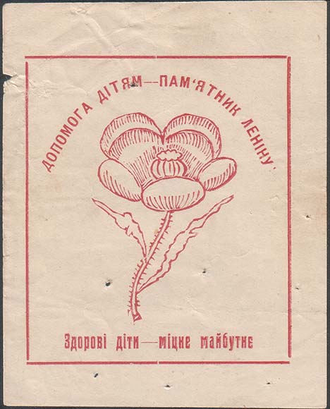 1928 1928 г. 03.-04.06.1928 Разм. 78 х 96 мм. Одноцветная печать на белой бумаге. В прямоугольной рамке разм. 64 х 73 мм цветок мака. Сверху полукругом текст на украинском языке: «Помощь детям – памятник Ленину». Внизу текст на украинском языке: «Здоровые дети – прочное будущее».