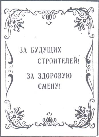 1930 1930(?) г. Разм. 59 х 81 мм. Одноцветная печать на серо-голубой бумаге. В центре в декоративной рамке 53 х 72 мм текст в четыре строки: «За будущих строителей! За здоровую смену!».