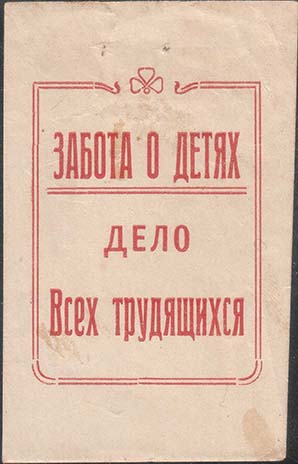 1930 1930(?) г. Разм. 49 х 77 мм. Одноцветная печать на белой бумаге. В центре в двойной декоративной рамке 39 х 51 мм закругленной внизу текст в три строки: «Забота о детях дело всех трудящихся».