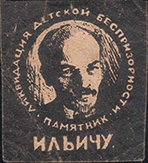 1930 1930(?) г. Разм. 50 х 54 мм. Одноцветная печать на желто-ватой бумаге. В центре портрет В.И. Ленина. По окружности текст: «Ликвидация детской беспризорности памятник Ильичу.