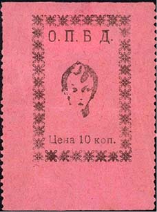 1930 1930(?) г. Разм. 38 х 52 мм. Одноцветная печать на розовой бумаге. Нерегулярная зубцовка. В центре в декоративной прямоугольной рамке разм. 25 х 34 мм голова ребенка. Сверху аббревиатура «О.П.Б.Д.». Внизу номинал: «Цена 10 коп.».
