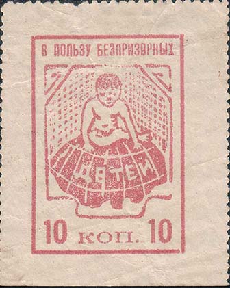 1930 1930(?) г. Одноцветная печать на бумаге различных цветов. Зубц. 11 1/2. В центре в прямоугольной декоративной рамке ребенок, сидящий на земном шаре. На земном шаре продолжение текста: «Детям». Внизу номинал: «Цена ... коп.».
