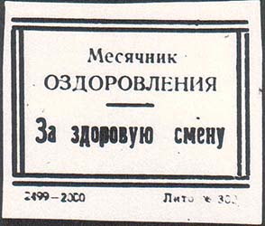 1930 1930(?) г. Разм. 50 х 42 мм. Одноцветная(?) печать на белой(?) бумаге. В двойной прямоугольной рамке разм. 42 х 50 мм сверху текст в две строки: «Месячник оздоровления». В центре горизонтальная черта. Внизу текст: «За здоровую смену».