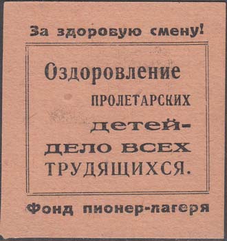1932 1932(?) г. Разм. 55 х 58 мм. Одноцветная печать на светло-желто-серой бумаге. В центре в двойной прямоугольной рамке разм. 45 х 37 мм тест в пять строк: "Оздоровление пролетарских детей - дело всех трудящихся". Сверху над рамкой текст: "За здоровую смену!". Внизу под рамкой текст: "Фонд пионер-лагеря".