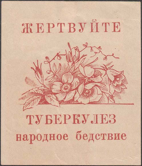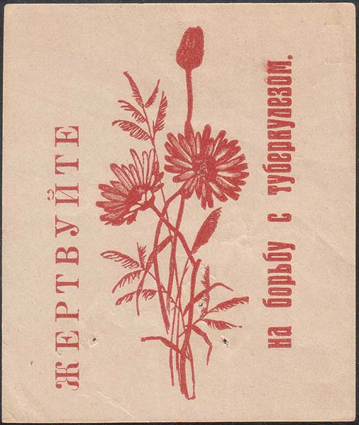 1930 1930(?) г. Разм. 62 х 73 мм. Одноцветная печать на кремовой бумаге. В центре букет из различных полевых цветов. Сверху текст: «На борьбу с туберкулезом». Внизу продолжение текста: «Жертвуйте».