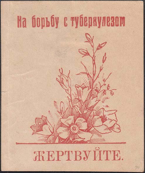 1930 1930(?) г. Разм. 62 х 73 мм. Одноцветная печать на кремовой бумаге. В центре цветы. Сверху текст: «Жертвуйте». Внизу текст в две строки: «Туберкулез народное бедствие».