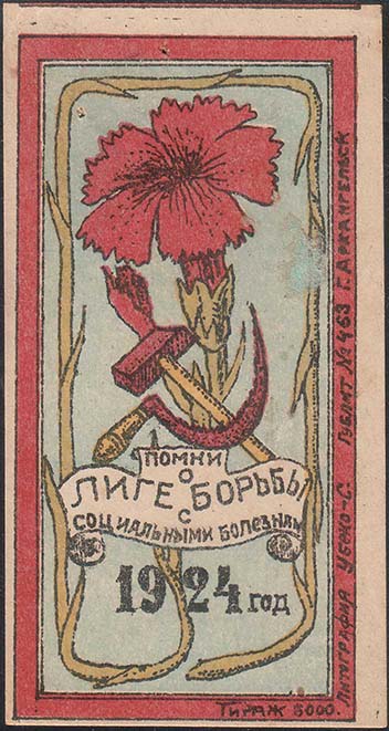 1924 1924 г. Разм. 44 х 82 мм. Многоцветная печать на плотной белой бумаге. В двойной прямоугольной рамке разм. 39 х 78 мм в центре цветок гвоздики, серпи и молот. В центре на картуше текст в пять строк: «Помни о Лиге Борьбы с социальными болезнями». Внизу дата: «1924 год». Внизу и слева между рамками выходные данные: «Тираж 6000. Литография Убеко - С. Гублит №463 г. Архангельск». На оборотной стороне оттиск фиолетового штампа с текстом в три строки: «Представитель по филателии и бонам на Севере России».