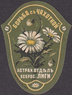 1913 1913 г. Виньетка сложной формы в виде щитка разм. 40 х 52 мм. Трехцветная печать на белой бумаге. В центре в фигурной рамке букет цветов ромашки. Сверху полукругом текст: «Борьба с чахоткой». Внизу текст в две строки: «Астрах[анский]. отдел Всерос[сийской]. Лиги». Слева внизу с наружной стороны рамки выходные данные мелким шрифтом: «Фаб. т-ва Астрах. лит.».