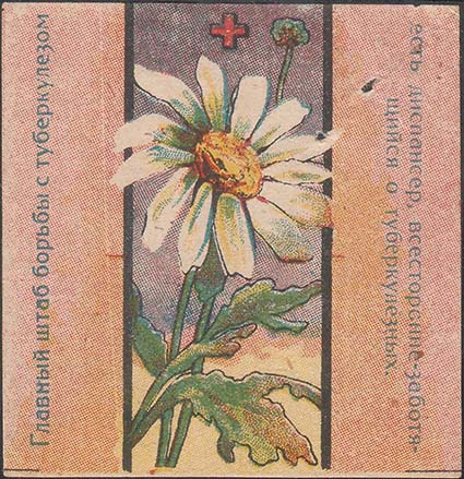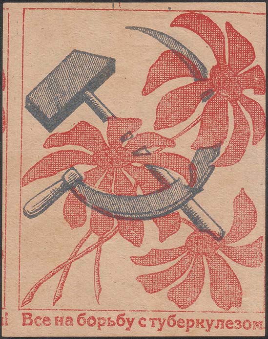 1925 1925(?) г. Разм. 68 х 87 мм. Двухцветная печать на кремовой бумаге. В прямоугольной рамке разм. 65 х 77 мм скрещенные серп и молот и три цветка ромашки. Внизу под рамкой текст: «Все на борьбу с туберкулезом».