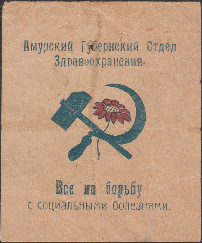 1928 1928(?) г. Разм. 82 х 98 мм. Двухцветная печать на желтоватой бумаге. В центре скрещенные цветок, серп и молот. Сверху текст в две строки: «Амурский Губернский Отдел Здравоохранения». Внизу текст в две строки: «Все на борьбу с социальными болезнями».