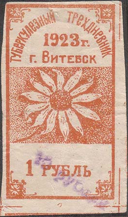 1923 1923 г. Разм. 33 х 54 мм. Одноцветная печать на тонкой белой бумаге. В прямоугольной рамке разм. 28,5 х 50 мм с орнаментом по углам в центре на сплошном фоне цветок ромашки. Сверху текст в три строки: «Туберкулезный трехдневник 1923 г. г. Витебск». Внизу номинал. Внизу по диагонали фиолетовый оттиск ручного штампа с надпечаткой нового номинала в виде текста: «15 рублей». По углам разграничительные линии. На оборотной стороне синими чернилами новый номинал в виде текста: «1 руб. золот. ... (подпись)».