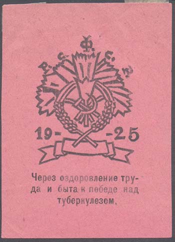 1925 1925 г. Разм. 79 х 57 мм. Одноцветная печать на розовой бумаге. В центре стилизованное изображение цветка ромашки, серп и молот, в обрамлении венка из колосьев пшеницы. Сверху аббревиатура «Р.С.Ф.С.Р.». Внизу лента. По бокам цифры даты: «1925». Внизу текст в три строки: «Через оздоровление труда и быта к победе над туберкулезом».