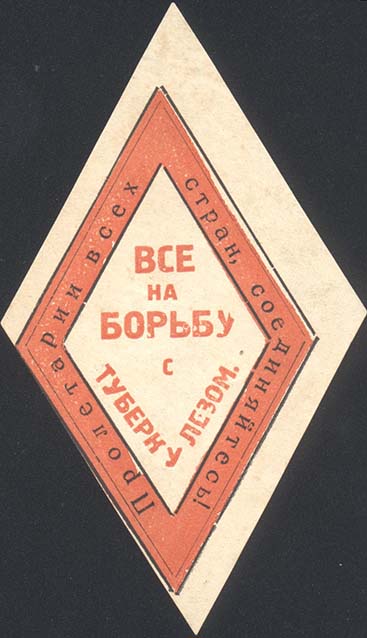 1926 1926 г. Август. Ромб разм. 61 х 108 мм. Двухцветная печать на белой бумаге. В центре в двойной рамке в форме ромба разм. 86 х 51 мм текст в пять строк: «Все на борьбу с туберкулезом». По периметру между рамками текст: «Пролетарии всех стран, соединяйтесь!».