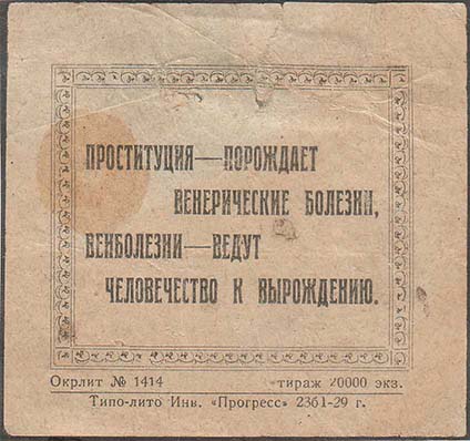 1929 1929 г. Разм. 70 х 66 мм. Одноцветная печать на серо-зеленой бумаге. В прямоугольной декоративной рамке разм. 55 х 46 мм текст в четыре строки: «Проституция – порождает венерические болезни, венболезни – ведут человечество к вырождению». Внизу под рамкой выходные данные мелким шрифтом: «Окрлит №1414. Тираж 20 000 экз. Типо-лито. Инв. «Прогресс» 2361-29 г.».